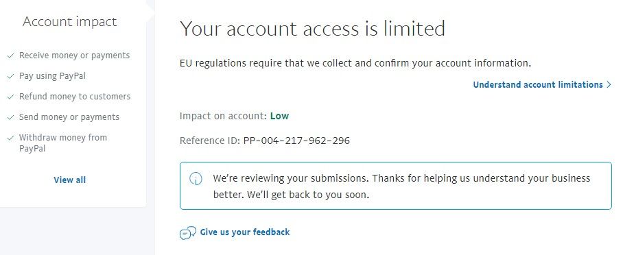 We want to help ensure PayPal is a secure place to do business. We noticed some changes in your account that require further verification. During this time, you may not have access to certain account activities. Please review the Account impact section for more information about what you can and cannot do.