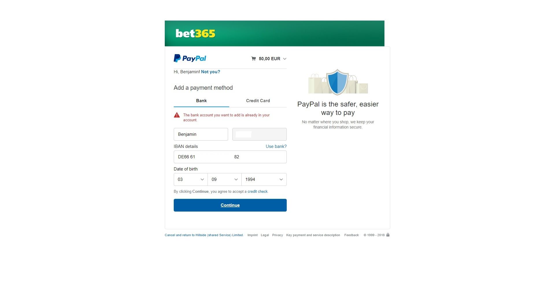 Nézd írtam nem igazán tudunk itt segíteni, de a bet365 PayPal fizetési szabályait kellene megnézni. HA a PayPal fiókodban a bankszámla a bankod engedélyével használható fizetésre és az látszik akkor a bet365-nél van gond.