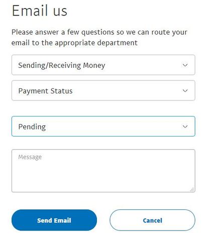 Alul Kapcsolatfelvétel, a borítékos Email us, a téma Sending/Receiving Money, altéma Payment Status és ott a Pending, alulra hogy az X számú tranzakció még miért van függőben és Send Email