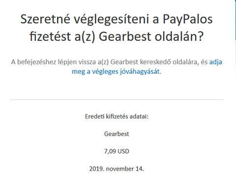A Gearbest oldaláról szeretem volna rendelni egy fülhallgatót és PayPal-al szeretem volna kifizetni,beléptem a paypal profilomba(bankkártya van hozzá csatolva) de fizetés előtt,még szeretem volna még egyszer elolvasni a termék leírását.Utána láttam,hogy már le is vonta a termék árát a paypal-ról és ezzel együtt ugye a bankszámlámról is.Írtam a Gearbestnek,hogy ilyenkor mi van azt mondták,hogy nem kapták meg a pénzt így vissza mondtam a rendelést,majd egy jó 15-20 perccel később kaptam egy e-mailt a PayPal-tól,hogy véglegesítsem a fizetést,amit sajnos már lemondani sem tudok,se megerősíteni,mert a termék rendelését visszamondtam.