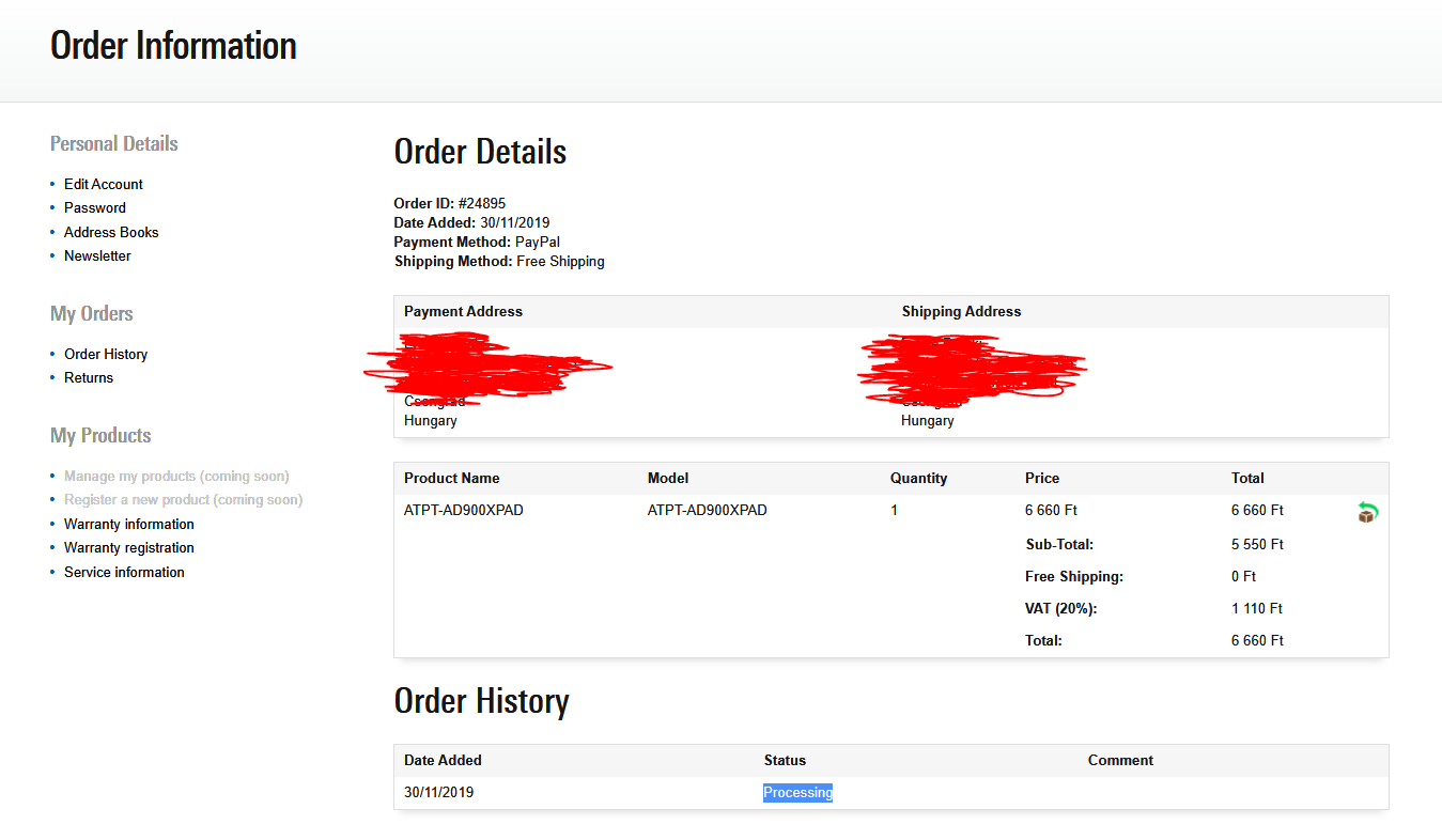 Itt van a rendelés összesítője az Audio-Technika fiókomban: