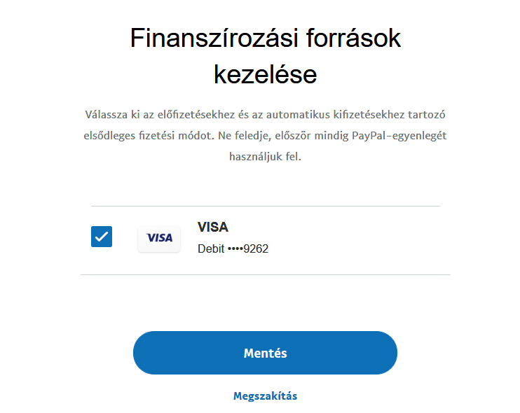 Lassan egy órája szopok azzal, hogy egyszerűen nem találom a konverzió beállítást. Azt hozátenném, hogy csak alkalom szerűen fizetek Paypal-al, utoljára valamikor 2018-ban. Nézem az útmutatót, eddig eljutok, hogy "Finanszírozási források kezelése". Ezt megnyitva viszont csak annyit látok, hogy elsődleges a Visa kártyám, de ott semmilyen más opció nem érhető el, mint ami az összefoglalóban mutatva van.