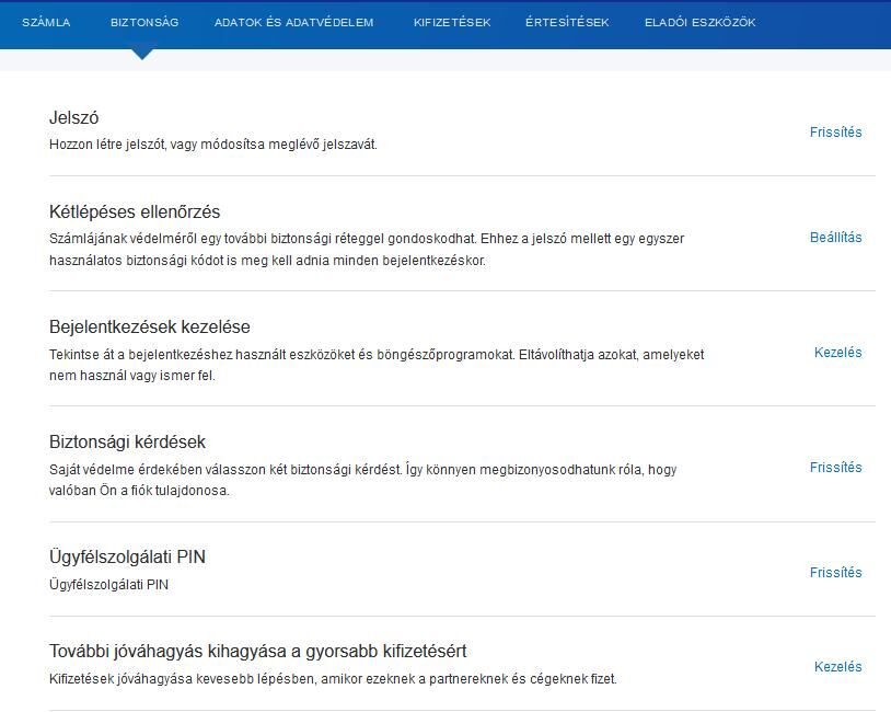 fogaskerék ikon után a Biztonság, Security menüpontAz első gomb a PayPal Checkout a gyors fizetés, ekkor csak belépsz és fizetsz, semmit nem tudsz állítani, de legközelebb már csak fizetsz, ha a másodikat választod Proceed to Checkout ott látod a rendelés minden részletét, ha kell akkor változtatsz és azután amikor fizetsz választod a PayPal-t, persze az már rendes belépése fizetés lesz minden alkalommal.