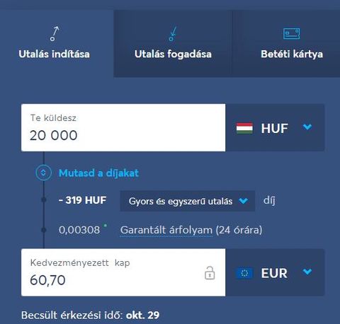 Pl 60,7 €, 20000 Ft kártyáról 319 Ft és holnap a bankszámláján lenne, de legkésőbb kedd.A bankom utalás esetén 334,16 Ft-ot számolna 1 €-ra és nálam is van a közel azonos mértékű +díj mint neked, itt az € árfolyam 329,48 Ft és az ösz díj 319 Ft , kb 1 €.