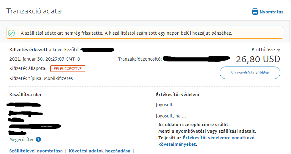Nyomkövetési számot meg lehet adni, de aliexpressen olyan shipping módot választottam ahol nincs nyomon követés. Beállítottam így a követés nélkülire a paypalon, de ezt írja utána: "A szállítási adatokat nemrég frissítette. A kiszállítástól számított egy napon belül hozzájut pénzéhez." Ha nincs nyomkövetési szám, honnan tudja mikor érkezik meg a csomag?