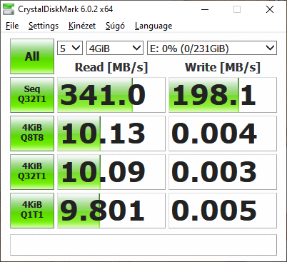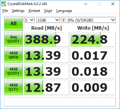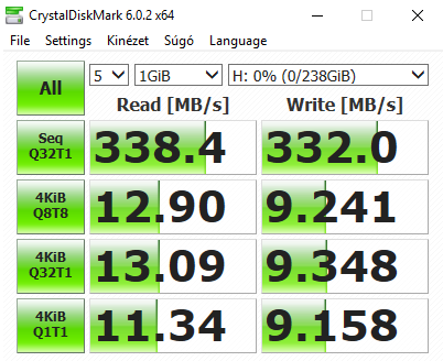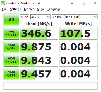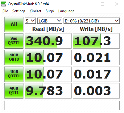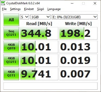 Mint látható konstans 14-15 mb/s-al ír ami ennyiért rendben van. Érdekesség képen a htpc-n is elvégeztem a Crystal tesztet, és ott a B365-ös lappal jobban muzsikált, ergo az Z370-es lapomnál valami nem gömbölyű usb/írás terén, de erről rég tudok és nem nagyon tudok mit kezdeni vele...(az no1-no2 ne tévesszen meg senkit)