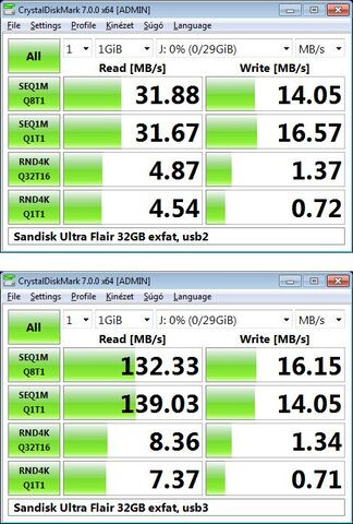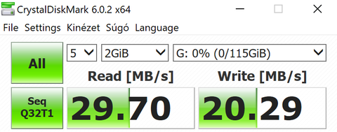 • Az USB 3.1 Gen 2 (USB 3.2 Gen 2 | 10 Gb/s) és USB 3.0-s (USB 3.2 Gen 1 | 5 Gb/s) eredményeket korábban már szemléltették itt az említett pendrive-nál, USB 2.0-n pedig a szokásos max. 25-4x MB/s várható (példák). + Evidens, hogy ha egy pendrive képes a 10 Gb/s USB 3.2 szabványt kimaxolni, akkor nyilván az USB 3.0 és USB 2.0 szabványokat is.