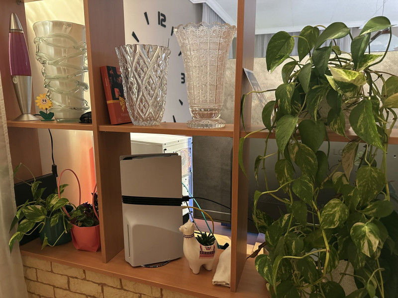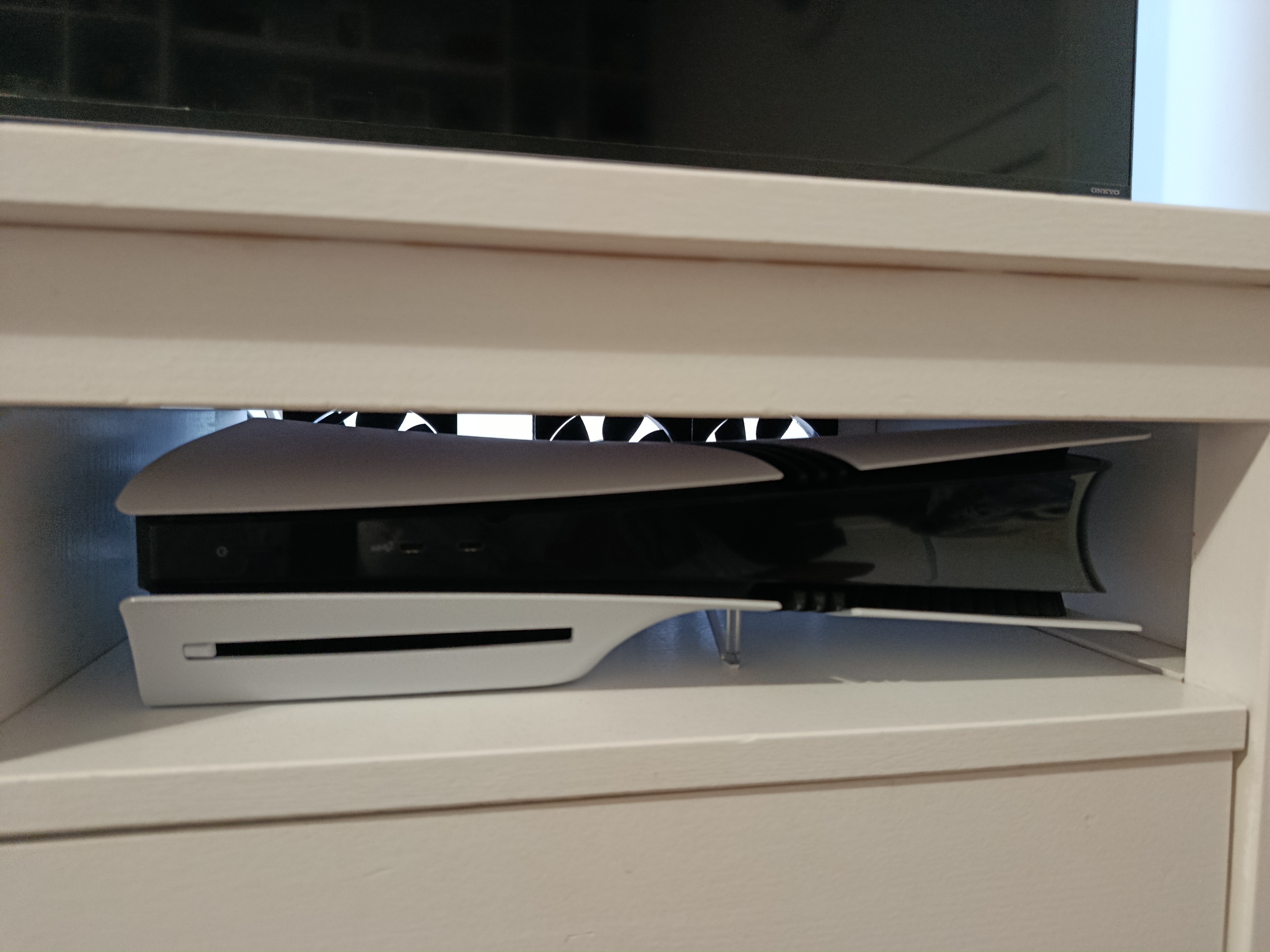 A PS5 elől (a lekerekített, vastagabb résznél) szívja be a levegőt és hátul ki. Az hogy az oldallapokon (mellett, alatt, felett, akármi) túl mi a helyzet, nem sokat számít a belső hőmérsékeltben. Szóval ami igazából fontos, hogy előtte legyen friss levegő, ami itt adott és hátul tudjon távozni a meleg, ami szintén adott.
