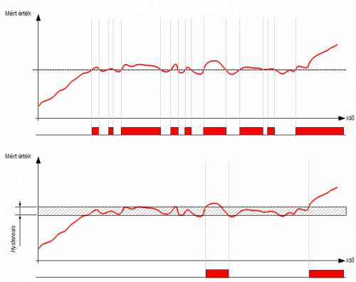 - Valósíts meg az előző blokkal (vagy azt egészítsd ki) olyan küszöb érték kapcsolót, aminek állítható hiszterézise van. Tehát beállítasz 114 bar nyomást, az legyen a hiszterézis tartomány fele. Ha a mért érték átlépi hiszterézis tartomány tetejét, akkor kapcsoljon be egy bitet, és csak akkor kapcsolja ki, ha a mért érték a hiszterézistartomány alja alá esik.
