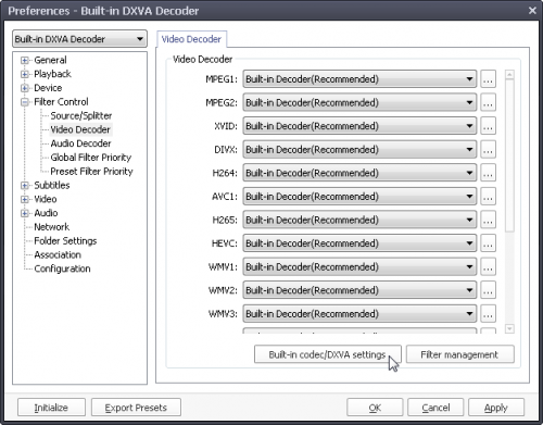 Nálam alapból a Built-in DXVA Decoder config az aktív már elég régóta. Nem én állítottam arra, hanem a program. Nem nyúltam hozzá, mert nem tudom melyik a legmegfelelőbb a gépnek, pl a Video renderer: EVR Custom Present alapból (win7 gépen), de régi xp-s gépen az auto selection volt.