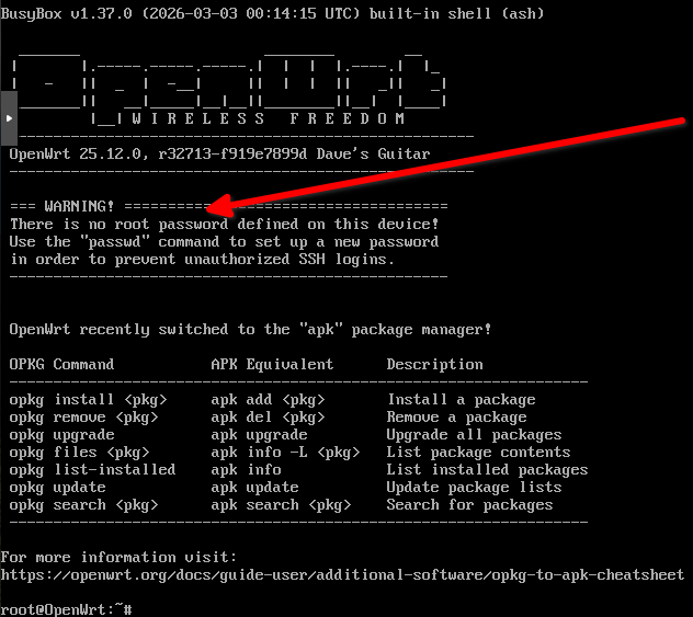 Még egy tipp, ha nem akarsz openwrt shell-en gépelni, akkor lépj be az owrt vm-be ssh-n (default IP címe: 192.168.1.1) root felhasználóval, és azzal a jelszóval, amit a shellben megadtál a "passwd" parancs után.