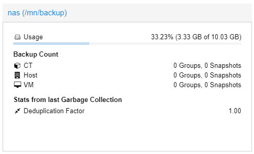 Sziasztok, felraktam VM-be egy backup szervert. NFS-el csatolom fel a távoli NAS-t. A gond az, hogy 10GB lát a pbs, amount-nál látszik a teljes méret (7TB), de ez csak 10GB lát belőle. Mit kell módosítani?