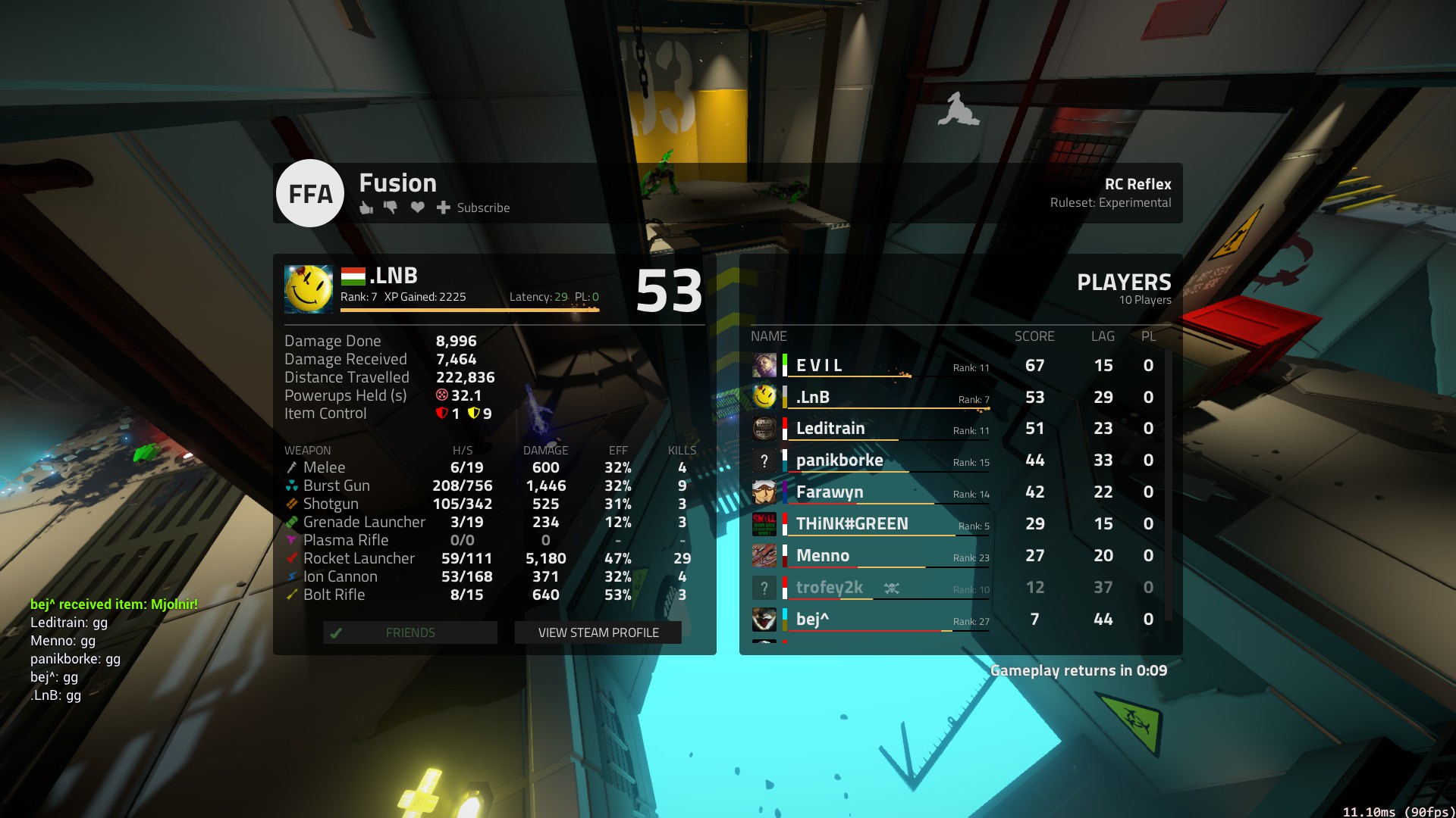 Átmentem Reflex-be, gondoltam nyomok egy meccset. És megnyertem életem első FFA-ját. Nem hinném, hogy ennyivel gyengébb lenne ott a játékosbázis. Van ott ugye rank rendszer amit felfoghatunk egy kezdetleges ELo-nak (nyilván nem teljes értékű), és mindenki sokkal magasabb szinten volt. Szal nem értem miért nem megy nekem ennyire a QL FFA. De nem is élvezem.