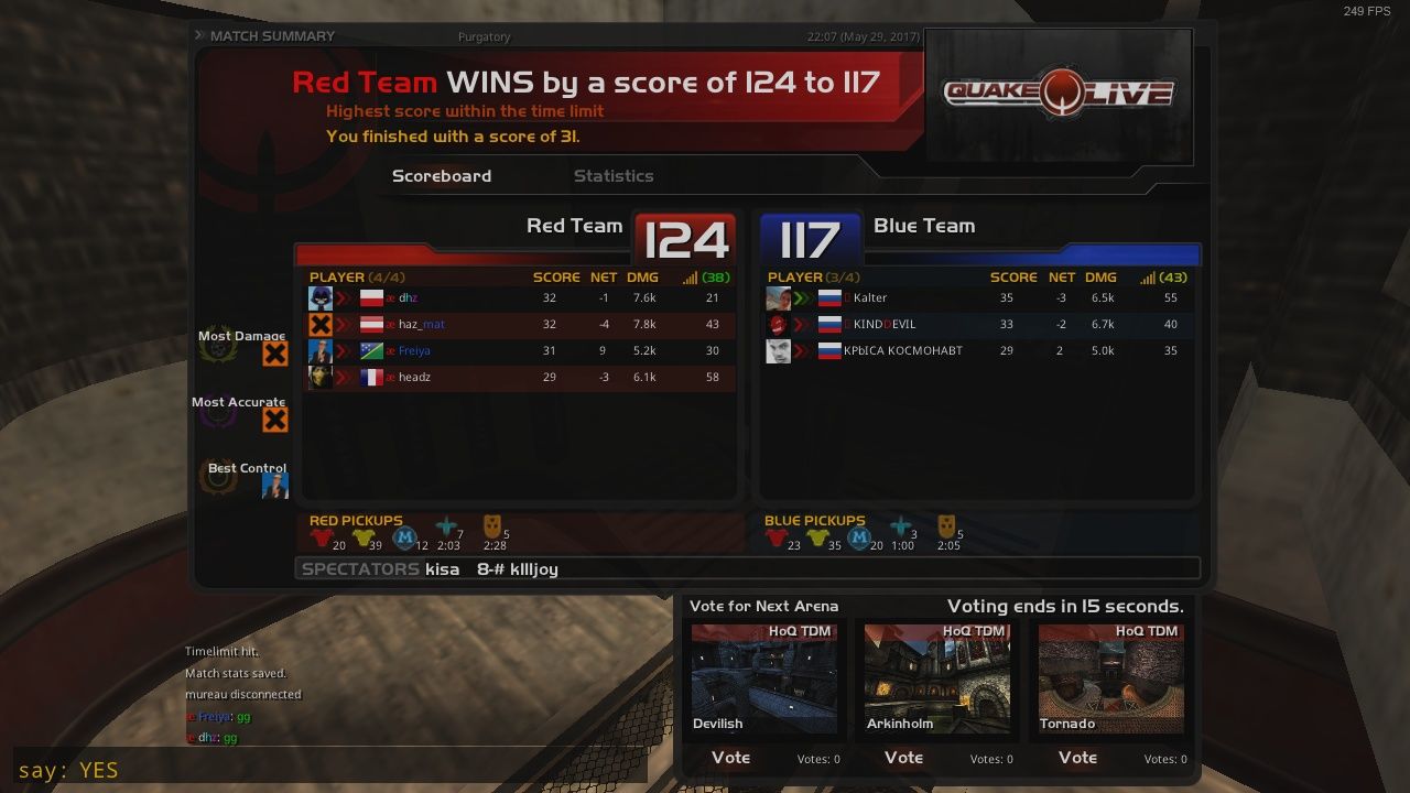 A magam részéről többet voltam az lg-környékén és kevesebbet (mint all-time) az RA-rg térségében a kelleténél, ez is közrejátszott. A rohadt idegesítő lag mellett. Esetenként a játék megfagy egy fél másodpercre és a célkereszt full random irányba és random fokban elugrik. Persze közben in-game történnek a dolgok. Fegyverváltás esetén gyakoribb. Imádom. No mindegy.Az ő pickük a Purgatory volt (szeressük mi is). Az elején úgy látszott, hogy hahó van, de aztán szépen stabilizálódtunk, visszaszereztük a rail controlt és bebiztosítottuk a wint, yay. Azért vicces, hogy mindketten nyertük a másik csapat mapját.