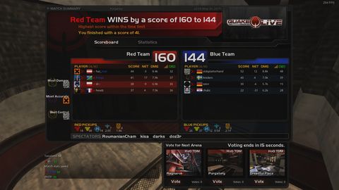 A remove-ok után a mindent eldöntő map a dm14 lett végül (Grim Dungeons). Ez sem indult rózsásan, nemszép hátrányban voltunk az elején, de aztán beindult a ninjázós gőzhenger. Elárasztottuk a Red roomot, lopkodtam a shaftokat és csapatjátékkal mercybe toltuk őket. \(: D)/