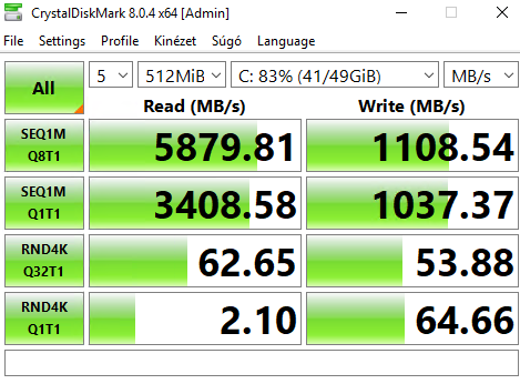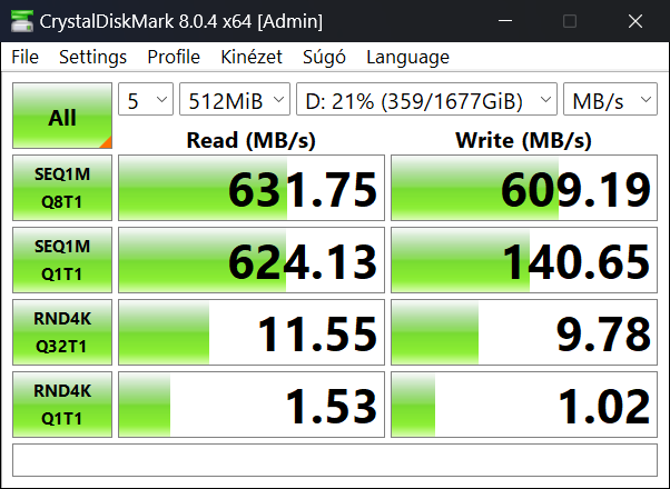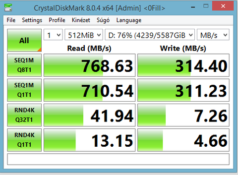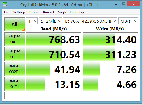 A RAID hardveres, a HP ML350p szerverben lévő gyári, x8 PCIe 3.0 sávot használ. Az az 1,02-ás érték a ChrystalDiskMark-ban nem kevés?