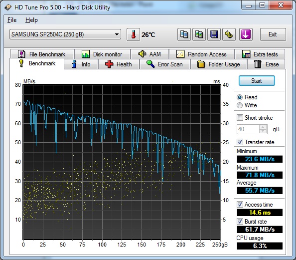 hd tune tud szép grafikonokat rajzol elérési idő címén, én azt használom. De egyébként a hd sentinel pro-ban is van véletlen elérési teszt ha megveszi az ember .