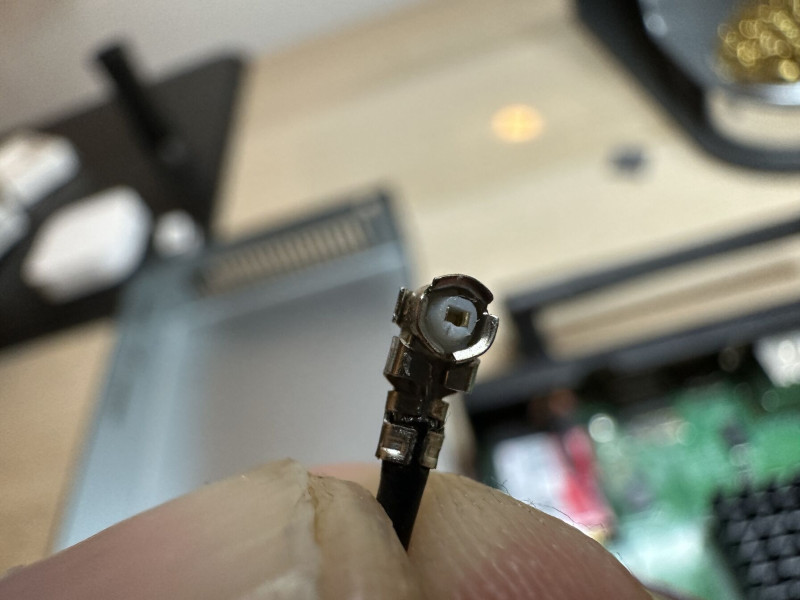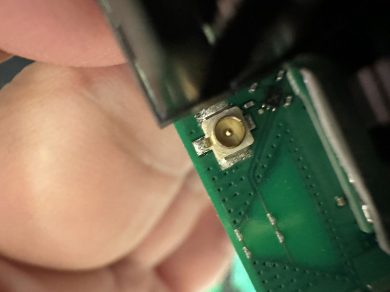 Naszóval, levettem a CM5-öt is az I/O boardról, hűtőbordástól, de sajnos a kis csatlakozó felületszerelt, és a thátoldalon nincs olyan forrpont, ami jól láthatóan a csatlakozó forró pontját jelentené, ezért felülről kell találni ilyent. Ideteszem a képet. A két nagyobbik (alsó-felső) forrpont az árnyékolásra megy, a képen baloldalinak konkrétan sem az árnyékolással, sem a forróponttal nincs kapcsolata (modjuk ez fura), valószínűleg a képen legkisebbnek látszó, jobboldali lesz a forróponté, de ahhoz meg a műszerem legvékonyabb tűjével sem tudok hozzáférni, olyan apró (amúgy az egész csatlakozó átmérőben kb másfél milliméter vagy kevesebb, eszméletlen pici, olyan vele szarakodni, mint kesztyűs kézzel bolhát fogni....