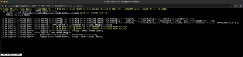 Vagyis az RDP service halott az RPi-n. Na jó, akkor indítsuk újra: