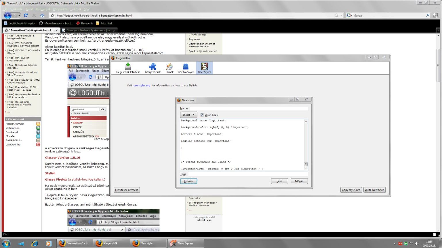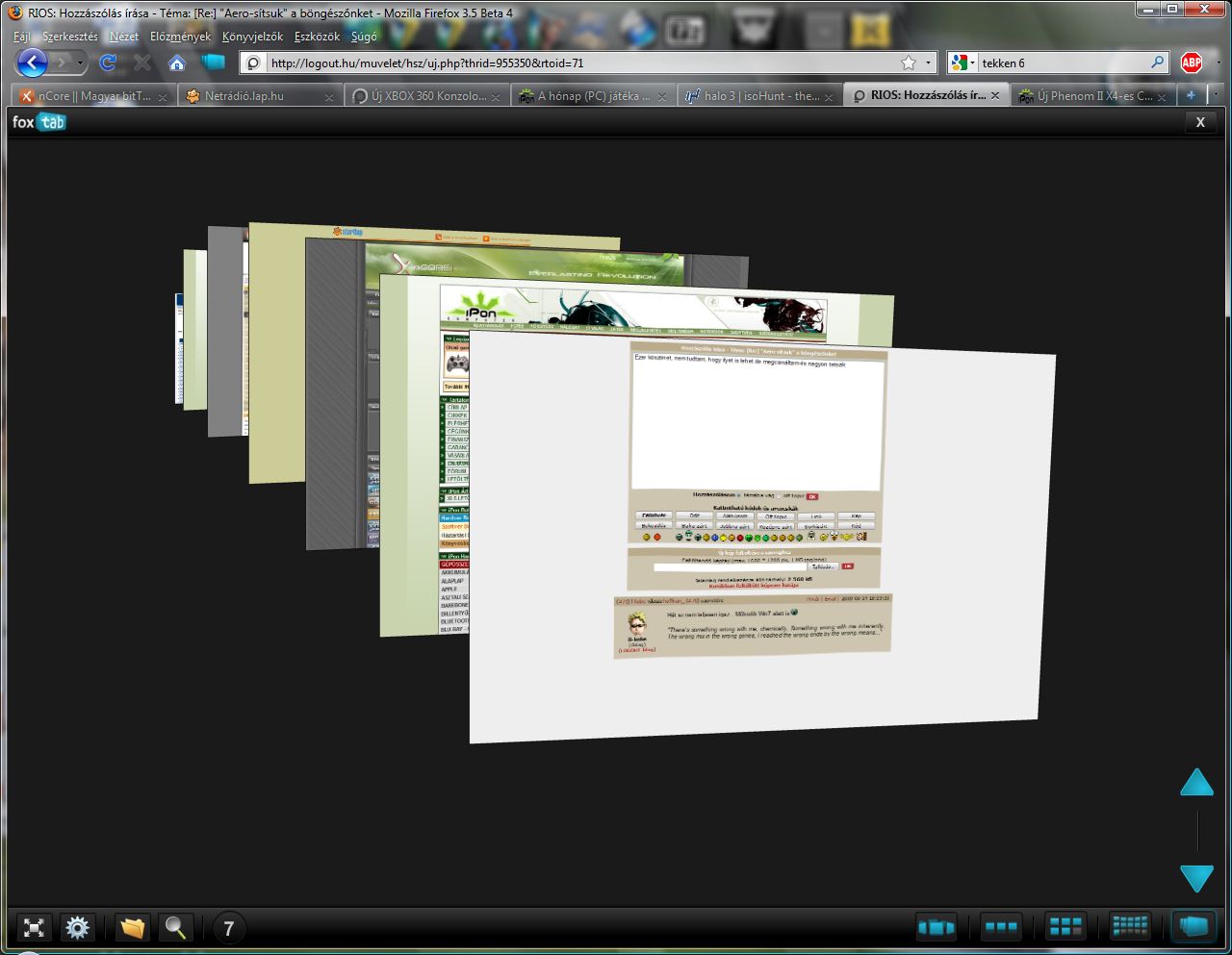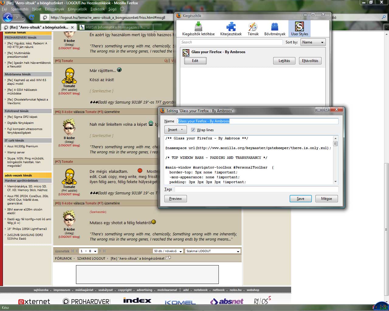 Az az igazság, h. nekem ez a teljes aerósítás nem jön be, picit máshogy használom. Az én kombóm: Vista-aero téma, Glasser, Hide Menubar kiegészítők és a VistaGlazz program. Teljes méretben így néz ki a FFom. És hasonlítsuk össze az IE8-at a FF-ommal.