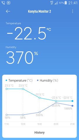 0 C°-60 C°-ig működik. Ma gondoltam egyet és betettem az egyiket a fagyasztóba. Láss csodát, az appal lekérdezve tökéletesen mutatja a hőmérsékletet. (Van betéve másik hőmérő is, így volt mihez viszonyítani.) A páratartalom már nem stimmel, és kivéve az LCD-n a hőmérséklet helyett csak egy L jelzés volt. Ezen felbuzdulva rendeltem még egy garnitúra hőmérőt