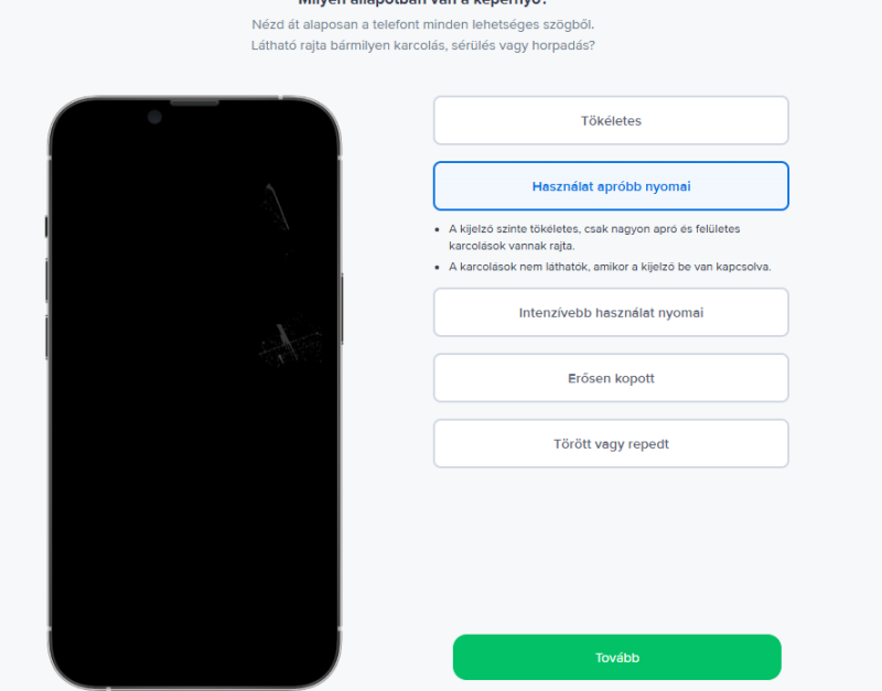 Ezt jelölném: "Használat apróbb nyomai A kijelző szinte tökéletes, csak nagyon apró és felületes karcolások vannak rajta.A karcolások nem láthatók, amikor a kijelző be van kapcsolva." -