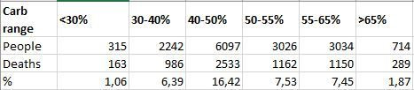 Bocs, kifutottam a szerkesztési időből, de még egy gondolatot azért idetennék: az, hogy mit akarunk kihozni a számokból eléggé befolyásolja, hogy mi jön ki. Nagyon rosszindulatúan és eléggé átlátszóan itt van egy számokkal alátámasztott táblázat, miszerint a kutatásban résztvettek közül arányaiban legkevesebben a low-carb és a hi-carb csoportból haltak meg, legtöbben pedig a 40-50%-osból: