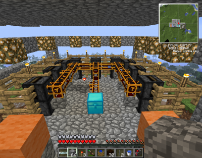 Most azzal próbálkozom, hogy mind a 25 ládát teljesen feltöltöm (a ládákban 1-1 stack "értékes" anyaggal, a többi csak cobble, hogy a feltöltés gyorsabban menjen), egy filterrel pedig "nyomás alatt" tartom a 25 ládát egyszerre, ezért ha valamelyikből kiveszek egy "értékes" item-et, akkor azt elvileg visszatölti. Mivel hosszú távon egyformán veszek ki a ládákból (facsemetéket fafarmhoz), ezért elvileg egyenletesen osztom el az anyagot... -