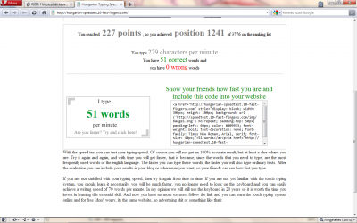 Azért egy kép belefér, egy jobb eredményemről...Nem tudok vakon írni egyébként. Suliban tanultuk (gépírás címszó alatt), két évig heti négy órában, de soha nem érdekelt. Jó eredményeket értem el, de nem vakon csináltam. Megjegyzem a szöveget, és fejből írom le, ezért utálok másolni. Fejből jobban írok, mert így szoktam. A szokás nagy úr...Na nem mentegetőzöm, íme: