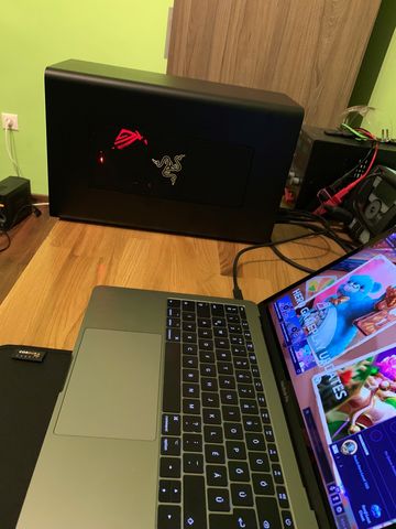 Ez csak egy fekete fémdoboz, benne a VEGA 64, egy szem TB3 kábel megy a MacBook-ba és még tölti is. Még nem jött meg a Mac Minim, azért van most a RCX erre kötve.. a noti csak hurcolászni lesz, nem játszani!Akkor van értelme, ha néha játszanál is.. és persze nem gond kidobni erre az ablakon 300ezret