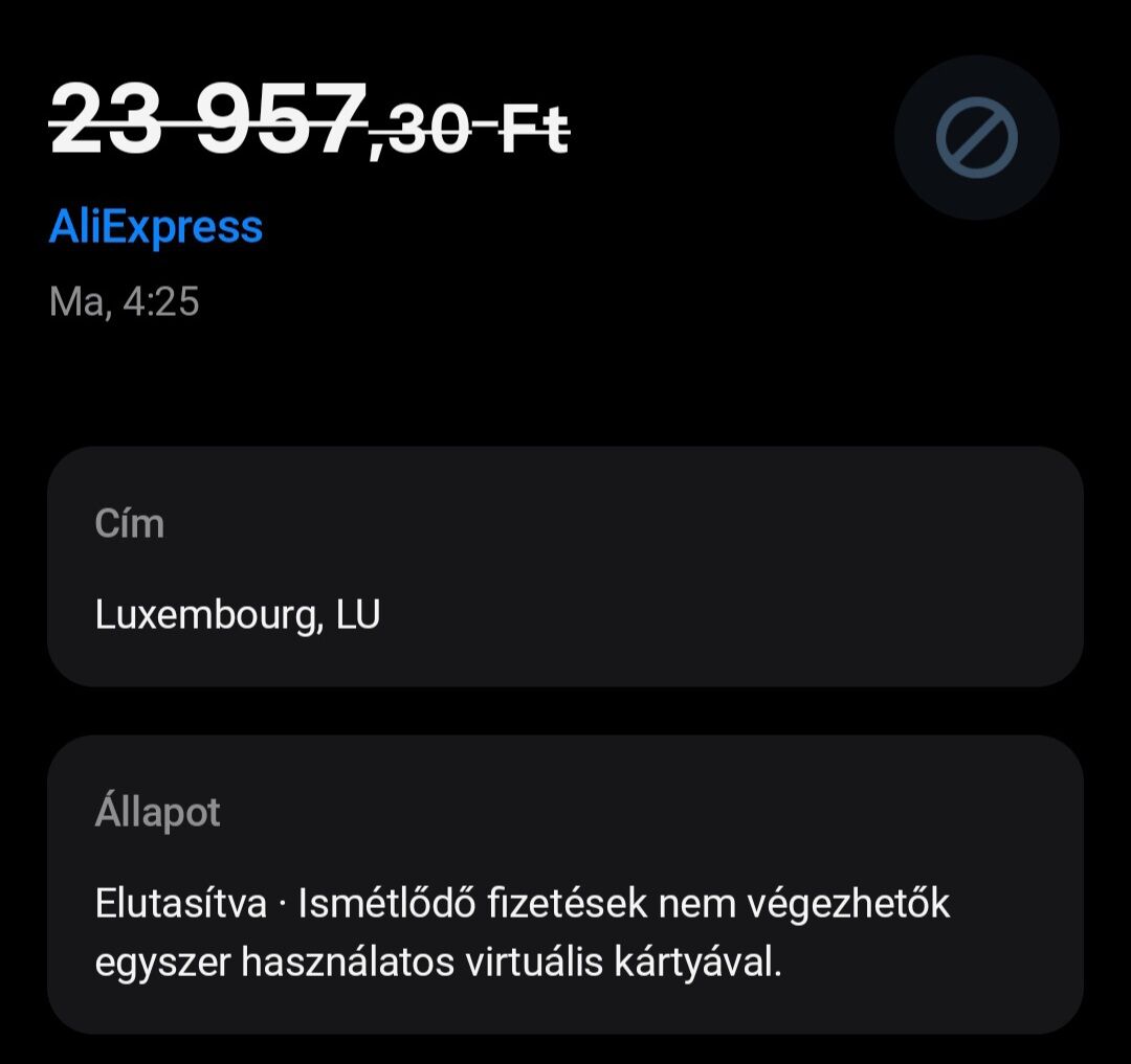 Fizetett mostanában valaki egyszer használatos virtuális kártyával aliexpressen? Nem hajlandó elfogadni az egyszer használatosat pedig már többször fizettem itt vele.