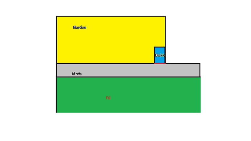 Piros határvonal a fű, sárga a ház, zöld a garázs lila a kocsibeálló.