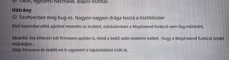 Takarítás- Nem tud át menni az 1.7 cm -es küszöbön 1x -2x megpróbálja és ennyi ,semmi forgás hogy oldalazva menjen mint a régi Mop 2 pro --az simán átment. Nem emeli fel a kerekeket sem annyira. Oda rámpát nem akarnak valószínű megy vissza az MM-be.