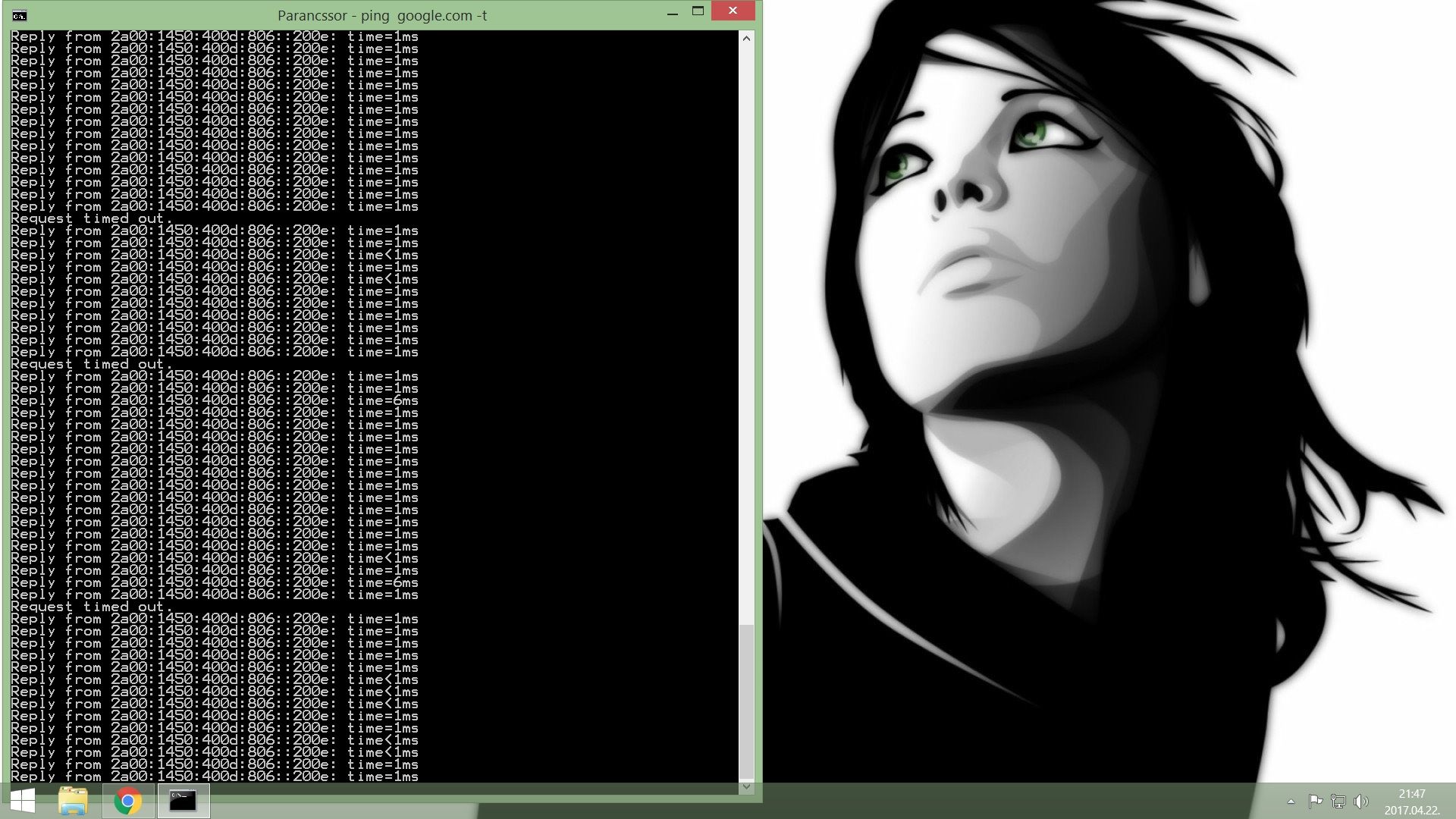 Folyamatos pingeltetésnél általában stabilan tartja a pinget (kb 95%-ban), a maradék meg vagy egy kiemelkedően nagy ping vagy egy Request timed out. Pl. google.com pingeltettem és ott 14ms a ping de időnként 28ms-ig is felugranak meg sok a request timed out.