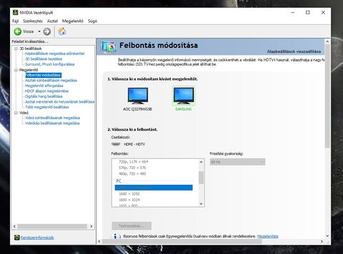 Hát látszik, hogy a TV-d beállításainál szürke minden, szóval az van, hogy a TV-d biztosan FullHD-t kap, a VGA-d viszont azt csinálja, hogy leskálázza a 2560x1440-et FullHD-ra, amivel picit jobb képminőséget kapsz. Ugye játékoknál van az NVIDIA-nál a DSR-nek nevezett dolog (Dynamic Super Resolution), ami ugyanezt csinálja, hogy mondjuk 2560x1440-as felbontást be tudsz állítani a FullHD monitorodra a játékon belül és így élesebb végeredményt kapsz, illetve nem kell AA-t azaz élsímítást használni.
