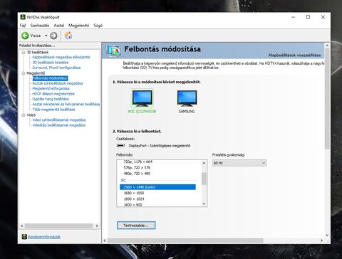 Gépházban és Nvidia vezérlőpultban 2560x1440, a TV-nél szürkén mutatja a felbontást.
