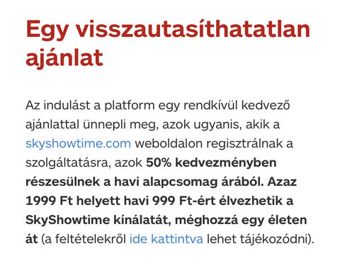 "In Albania, Kosovo, North Macedonia and Slovakia, SkyShowtime will be available for 5.99€ per month. In Romania, the service will be available for 3.99€ per month. In Czechia, the price will be 179 CZK per month, in Hungary 1999 HUF per month and in Poland 24.99 PLN per month." [link - a magyar oldalról is el lehet jutni hozzá: az "ide" szóra kell kattintani.