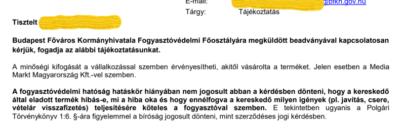 A helyzet egyre jobb lett. Miután a másik szervízből ignoráltak így írtam a fogyasztóvédelemnek. Akik szerint viszont a készülék minden minőségi kifogását azon vállalkozásnak kell orvosolnia ahol vettem, jelen esetben a MM. Ők is nagyon értenek hozzá. Látszik, hogy a bajnak nincsen gazdája https://ibb.co/qFsvyv4C
