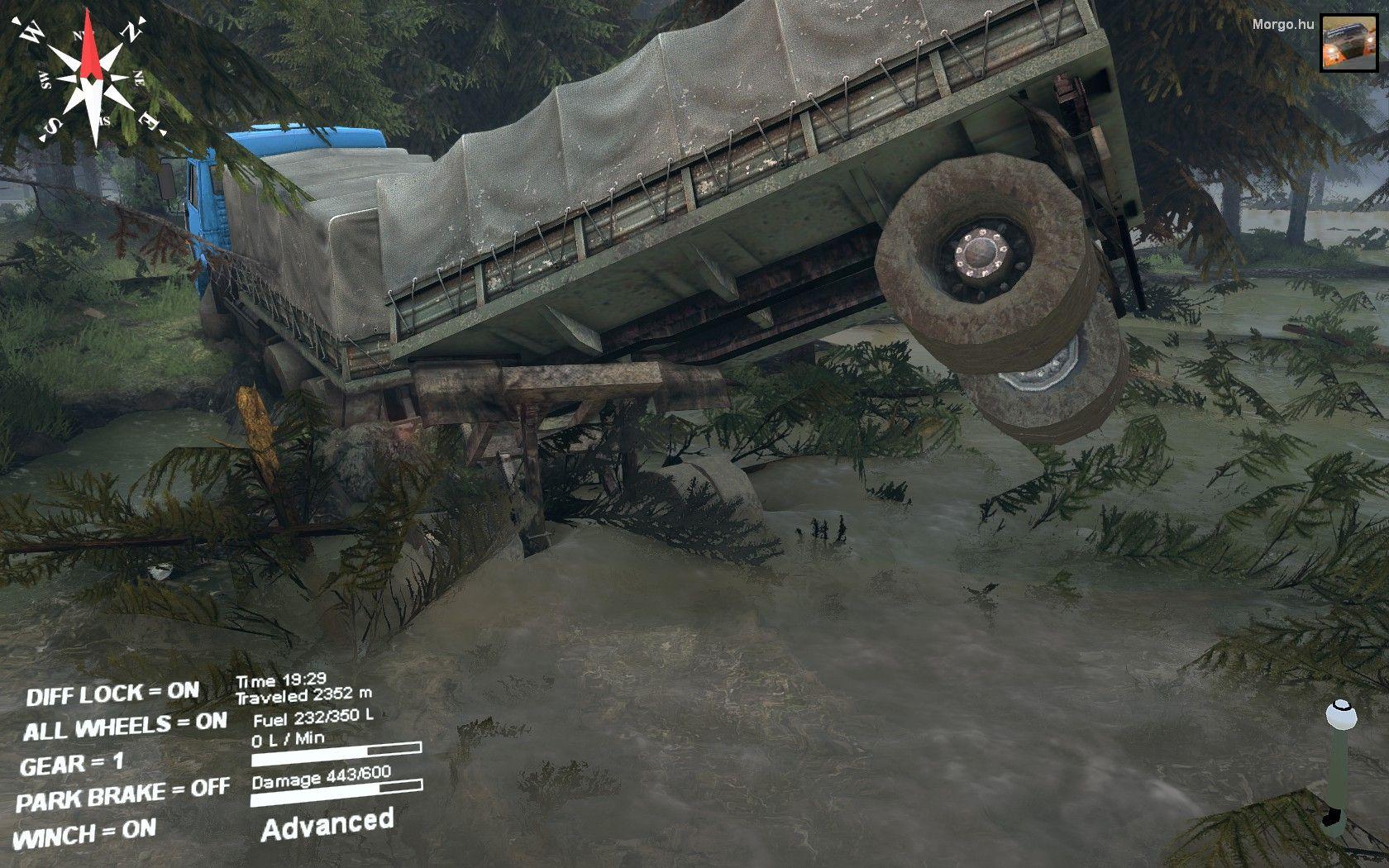 Én első nekifutásra a piros Kamazzal átjutottam, feloldottam minden járművet és takarást, a Mazzal mentem vissza, szerintem azzal is át lehet cibálni a kék Kamazt. Ráadásul leállított motorral nem is sérül a mély vízben.
