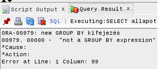 SELECT allapot AS "Állapot", ROUND(AVG(ar),2) AS "Átlag ár"FROM motorok GROUP BY allapot HAVING ar < 5000000;Nem az az ökölszabály, hogy a csoportostás alanyát kell SELECT után és azon kívül COUNT, Min, Max etc mehet? Akkor mégis miért kapok: