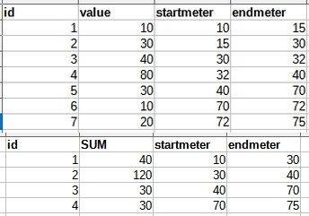 Egy oszlopban a SUM, egy startmeter (értelemszerűen a legkisebb érték az adott csoportban, a) és egy endmeter (MAX).Így néz ki az input tábla, alatta pedig az eredmény, hogy kell kinéznie: