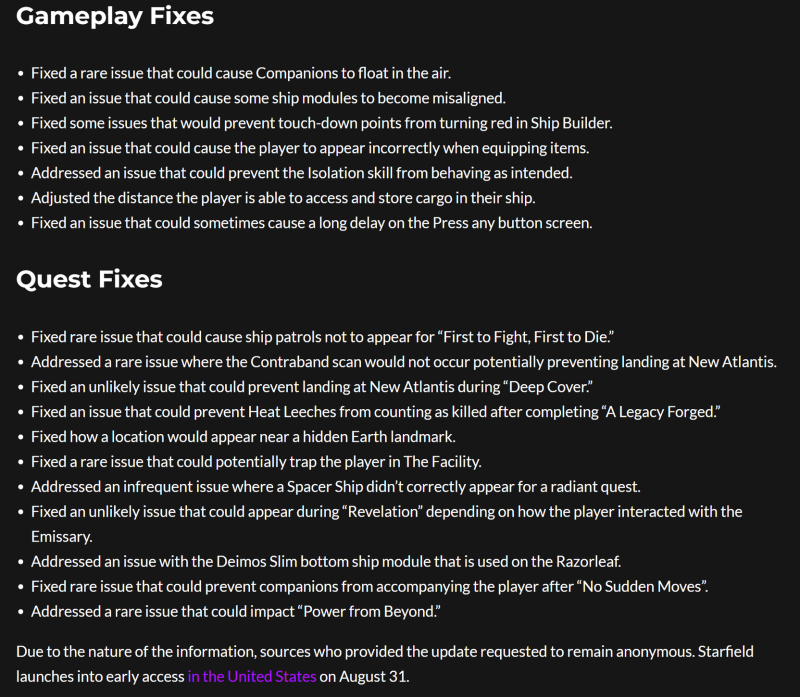 1. Céltalanul bolyongó NPC-k, nincs napi rutin, nem lehet velük beszélgetni, a leaker szerint ez a legnagyobb hibája a játéknak 2. Third person nézet sokkal jobb, mint eddigi Bethesda játékokban, jók az animációk 3. Miután egy bolygó közelébe teleportáltál a gravity drive-val, nem tudod megkerülni, az szimplán csak egy jpeg a háttérben 4. A bolygók-holdak-napok mechanikája elvileg elég jó lett 5. Semmi nem seamless, mindenhol töltőképernyő van. 6. Az űrhajók belső tereit nem lehet berendezni úgy, mint a házakat Skyrimben vagy a bázisokat Falloutban. Szimplán modulokból rakod össze, és azok már preset be vannak rendezve. Ha szállítós küldin csomagot veszel fel, az nem jelenik meg a hajón. 7. Csak egy follower 8. Nem lehet víz alá merülni, nincsenek folyók, nincsenek bolygók amiknek teljesen víz felszíne van 9. Gázóriásokon illetve azok körül nincs semmi felfedezni való -