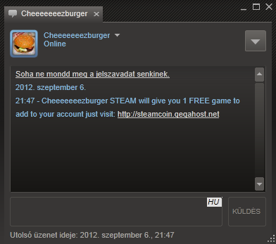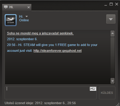 Most ingyen "ajándék" linkekkel próbálkoznak a csalók! Ha kapsz valakitől privát üzenetben egy linket, amin ingyen ajándékot kínál, ne kattints rá! A link 100%, hogy egy kamu oldalra visz, amivel ellopják a Steam accountodat! Az üzenet ismerőstől is jöhet!