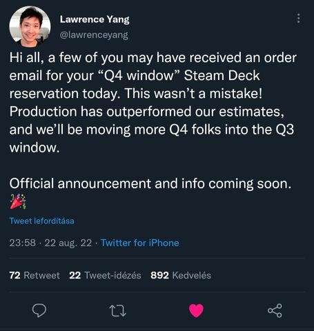 Megkaptam az üzenetet, hogy megkapom a steam deckem. Gondoltam ma este ki is fizetem.