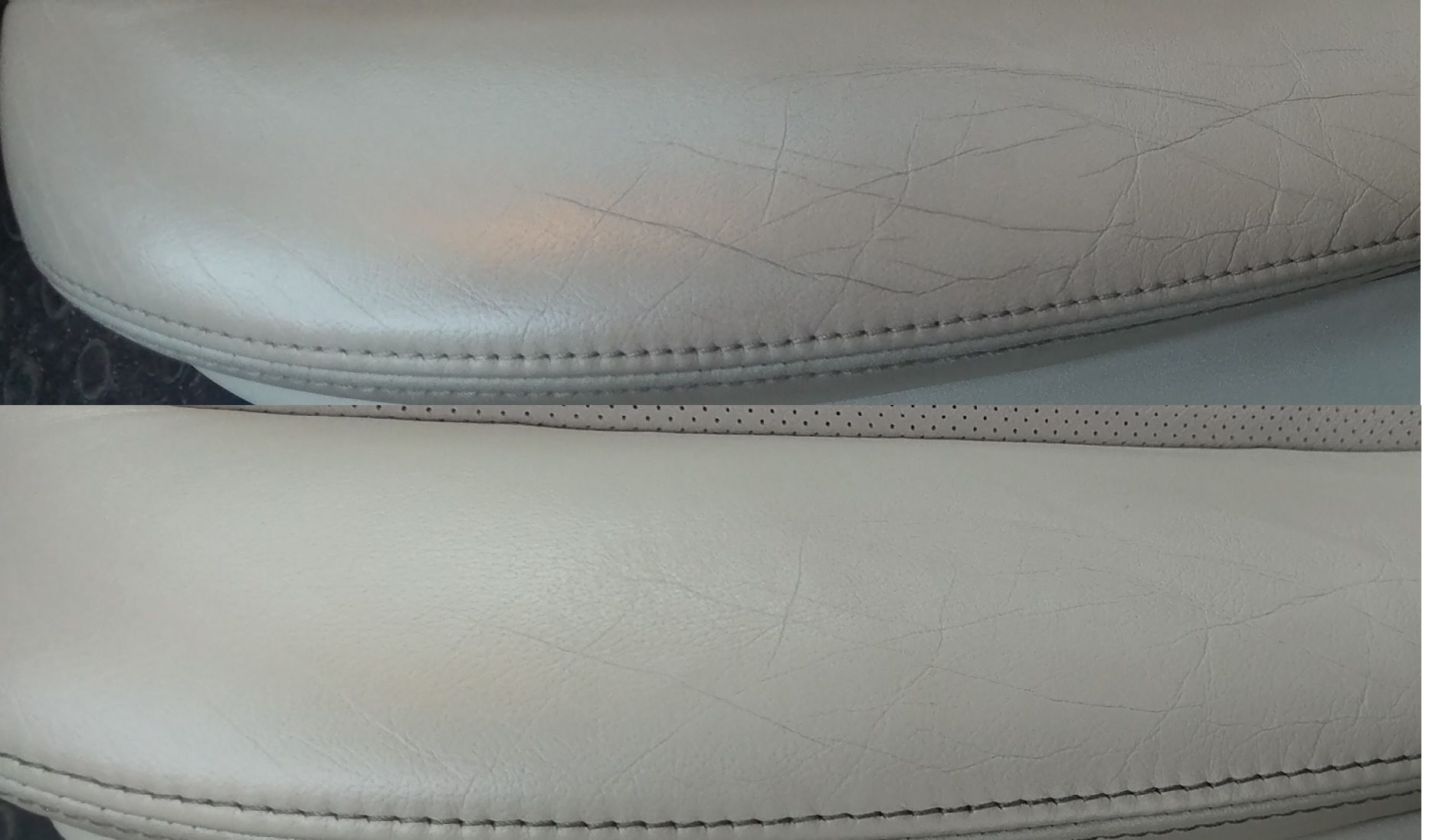 Azért közelebbről már igen. (előtte - utána kép). Az nem is nagyon jön át, de a fényes, csúszós felület sokkal mattabb és kevésbé csúszós lett (a párom megjegyezte, hogy még mindig fényes - no de 8 éves bőrön egy kezelés csodát nem művel, az idő kerekét pláne nem forgatja vissza.) Kis pihi kell még neki (48 óra kell, mire teljesen kifejti a hatását, persze azért használni lehet közben) Mindenesetre most kellemes bőrillat honol az autóban.