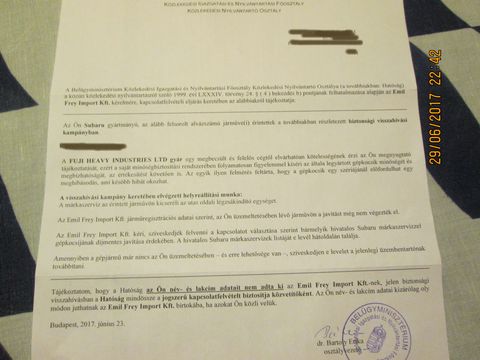 Az Emil Frey, mint hivatalos hazai Subaru márkakereskedő indított ilyen visszahívásos akciót, az utasoldali légzsák patron szenzor vagymi lehetséges hibája miatt, mert 1000-ből 1 autóban gond lehet vele. A Takata által gyártott légzsákok kapcsán. A gyártó oldalán is lehet csekkolni alvázszám alapján, hogy az autó érintett-e. Aki érintett, annak küldött a BM tájékoztatót, hogy hova lehet vinni az autót, hogy ingyenesen kicseréljék azt a szenzort.