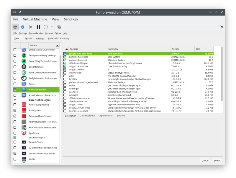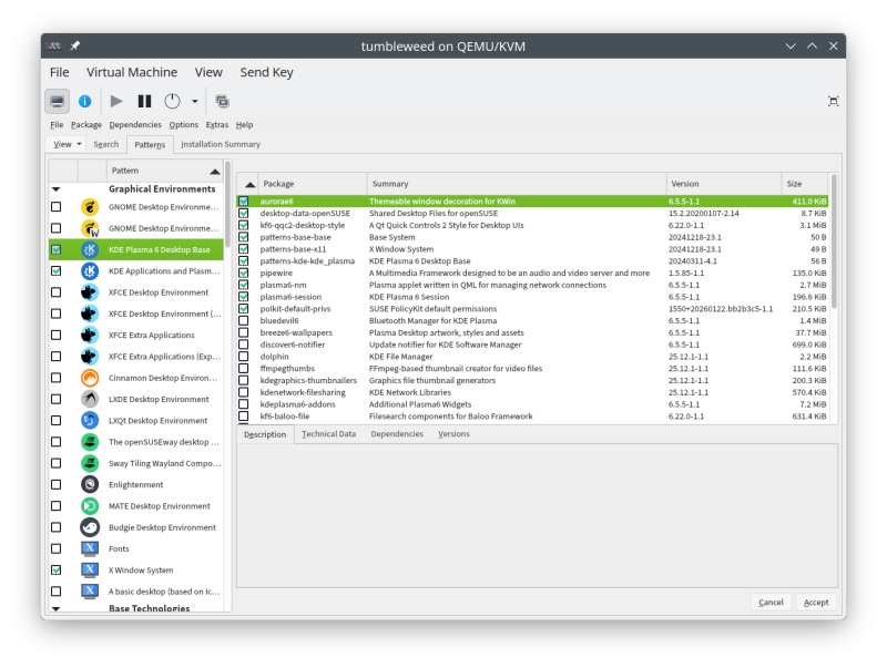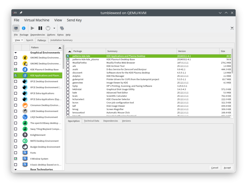 Utóbbit nyomogattam, az átveszi a KDE-s témát, előbbi valamiért nem.A zypper-t eddig csak egy-egy csomag telepítésére használtam főként, plusz most az upgrade-re. Meg még egy nagyobb monstrumot, a virt-manager-t tettem fel vele. Úgy rémlik szépen felrakta a teljes függőségi láncot egyből mint, hogy libvirt -> qemu -> kvm.
