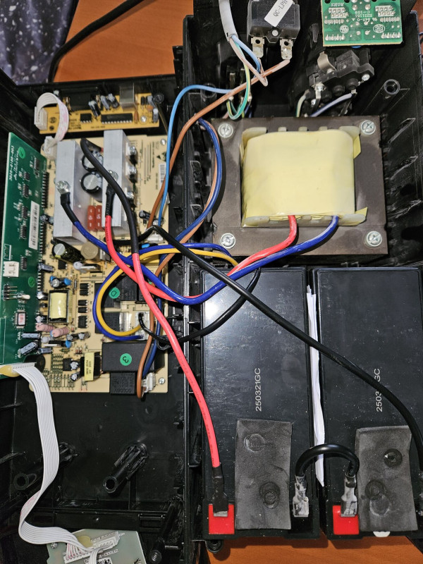 Minden mindegy alapon bedugva hagytam, legalább töltődjön. Pár óra után kattant benne egy relé. Ezután újra kipróbálva teljesen jól működött. A bypass működik, ha kihúzom, átvált akksira, azzal is megy. A feltöltött akksikra 26.9V-ot ad, szóval nem tölti túl. A kijelzőn normális dolgokat mutat. Az egyetlen, ami fura, hogy a nyákon a két alkatrészcsoport, ami alatt eleve megbarnult a nyák, infrahőmérővel mérve kb 50-55 fokosak. A házat összerakva viszont kívülről nem forrósodik fel, a tetején középen van egy tenyérnyi felület, ami meleg (~35-40 fok), de nem forró. Erre nem emlékszem már, hogy régen is ilyen volt-e, ezért kértem, hogy nézze meg valaki a sajátját.