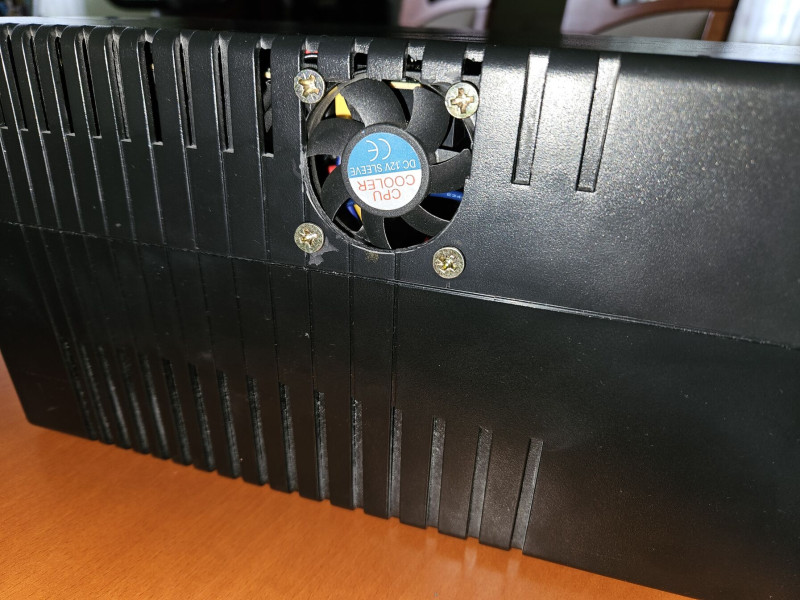 Mellé tettem egy kis 8cm-es ventit amit a router usb portjáról táplálok. 5V-on épp csak egy kicsit mozgatja a levegőt, de érezhetően hűvösebb a burkolat. Remélem így már kicsit hosszabb életű lesz. -