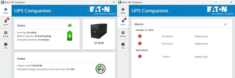 Tanácsot szeretnék kérni! Épp 2 éves elmúlt egy Eaton 5E 850i szünetmentes. Ma reggel egy kattanást hallottam és elkezdett sípolni, a rajta lévő eszközökről (router, modem) pedig elment az áram majd egyből vissza is jött, mert bootoltak éppen. Egyébként a házban nem volt áramszünet. Kihúztam a konnektorból az UPS-t és egyből elment újra az áram a csatlakozott eszközökről. Vissza dugtam, gépet bekapcsoltam, az alkalmazás szerint minden zöld, de az akku 0%-on volt. Elkezdett tölteni, mert pár perc után már 1% lett viszont nem akartam felügyelet nélkül hagyni egész nap, ezért kihúztam.